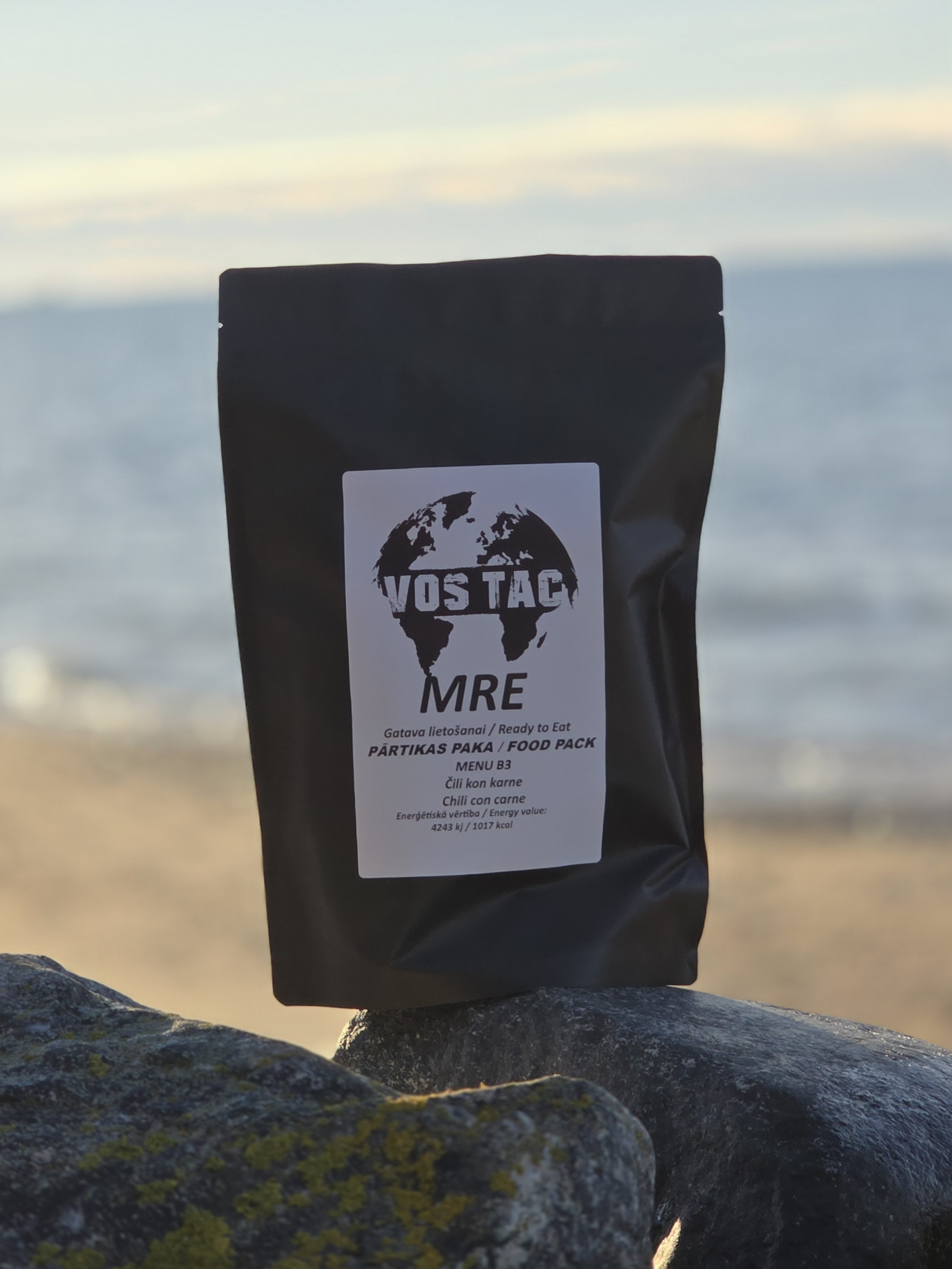 MENU B3 is a complete hot meal food pack with autonomous heating capability, designed for active outdoor use and situations where hot water or open fire is not available. The core of the pack is chilli con carne with beans and meat, complemented by wholegrain rye bread, liver pâté, an energy bar and hot drinks. The included heater bag allows the meal to be heated independently of external conditions, making this pack a premium solution for a full meal in any environment.